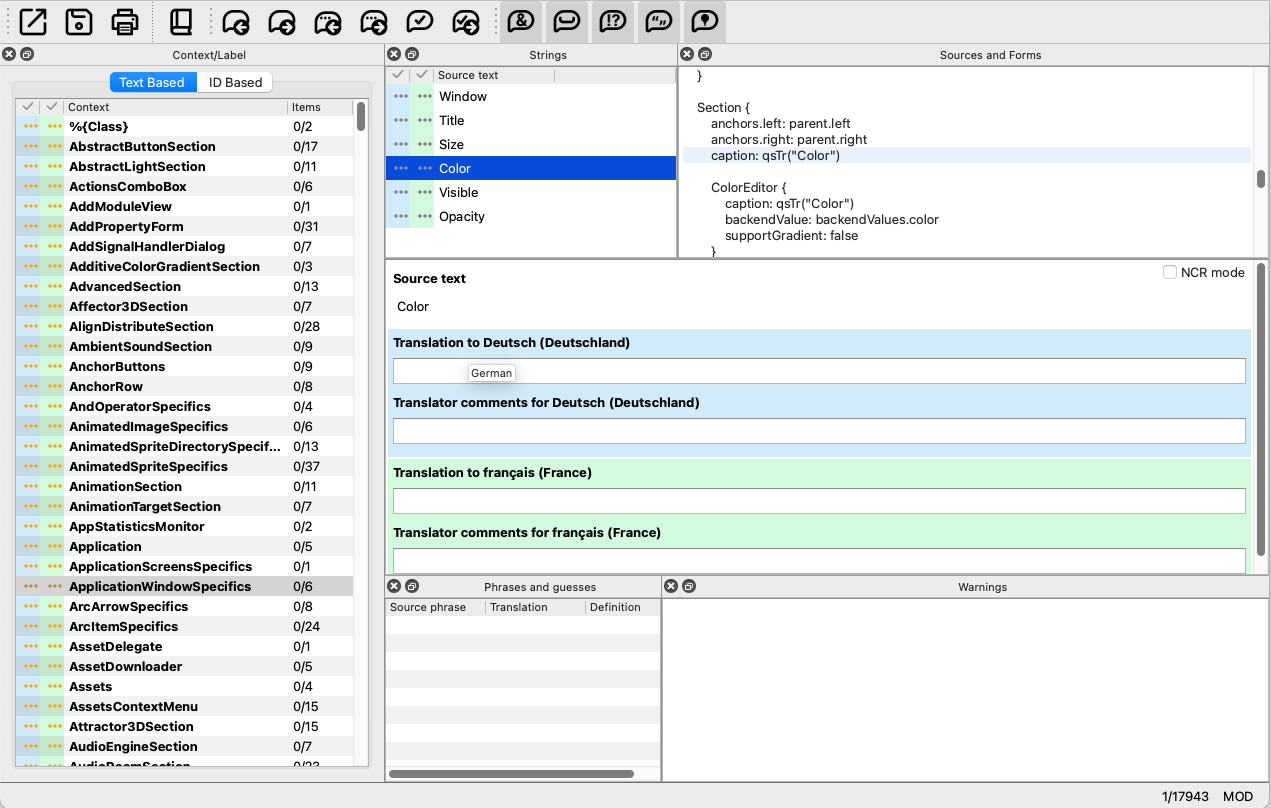 You can load and edit multiple translation files simultaneously. The following screen shot displays German and French translation files loaded.