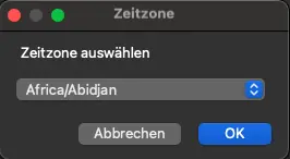 The dialog with a list of time zones (German version):